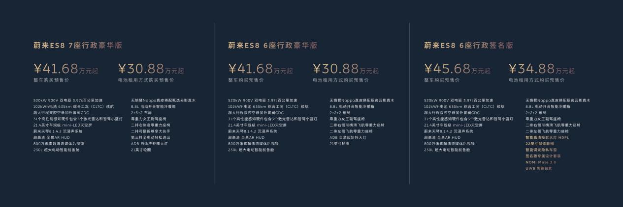 8月21日,蔚來全新 ES8 正式發布并開啟預售,行政豪華版六座/七座預售價 416,800 元起,采用 BaaS 電池租用方式購買,預售價 308,800 元起;行政簽名版預售價 456,800 元起,采用 BaaS 電池租用方式購買,預售價 348,800 元起。同時,據了解,全新 ES8 將于 9 月下旬正式上市并開啟交付。