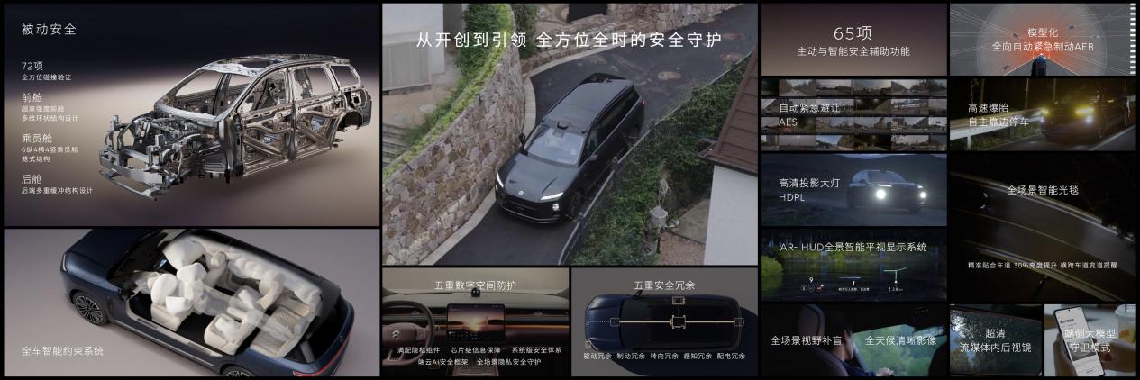 全新 ES8 為車內每位駕乘人員提供最周全的保護。超過行業標準的 72 項全方位碰撞驗證,實現超越全球五星安全標準的安全性能。6 縱 10 橫 8 豎乘員艙籠式結構,全向守護乘員和電池安全,全方位約束系統,配備同級最多的 11 個安全氣囊,為每位乘客提供全面安全防護。蔚來首創的主駕智能約束系統,可以判斷駕駛員身材和位置,自適應調整安全帶和氣囊,對不同身材的駕駛員實現更精準的保護。在第二排開發了同級唯一的大躺姿全向安全系統,包含同級唯一的雙坐墊安全氣囊,結合雙座椅集成式安全帶,超高強度座椅骨架和坐墊骨架潰縮吸能裝置,有效降低大角度躺姿下的安全風險。