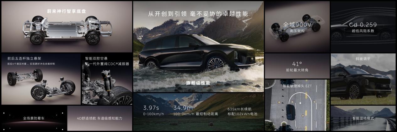 全新 ES8 搭載蔚來最新一代全域 900V 高壓架構,標配 102kWh 電池,配合 520kW 前后雙電機,峰值扭矩 700N·m,零百加速時間僅需 3.97 秒。全車 122 處空氣動力學優化,風阻系數低至 0.259, CLTC 綜合續航里程達到 635 公里。