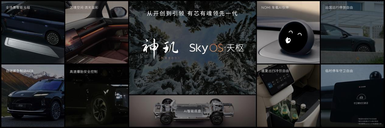 全新 ES8 與 ET9 共享蔚來十年科技創新成果,有芯有魂,擁有目前行業最先進的數字架構和整車全域操作系統。采用中央集成式架構,由蔚來自研的智駕芯片神璣 NX9031 與高通驍龍 8295 芯片組成中央計算平臺,具有充沛的算力和極高的集成度。同時,全新 ES8 還全量應用「SkyOS·天樞」整車全域操作系統,在底層打通智能硬件、計算平臺、通信與能源系統,實現對車聯、車控、智能駕駛、數字座艙、手機應用等全域應用的統一管理與協調,在 AI 時代構建真正的整車全域智能。