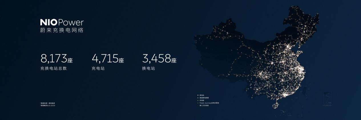 為了讓純電用戶也能擁有和油車一樣便捷的補能出行體驗,蔚來已構建起全球最強的補能網絡,截止 8 月 21 日零點,蔚來已在全國范圍累計建設 8,173 座充換電站,其中換電站 3,458 座、充電站超 4,715 座,充電站、換電站建設數量行業第一。建成 9 縱 11 橫 16 大城市群高速換電網絡,全國主要城市均可換電直達。以此為堅實保障,全新 ES8 是行業內補能體驗最好、唯一沒有續航焦慮的高端純電大三排 SUV。