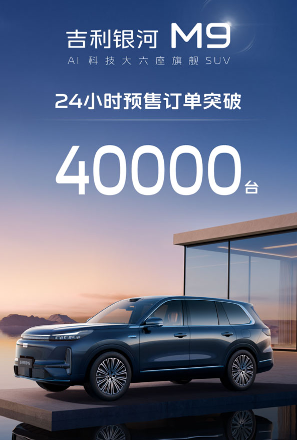 8月23日,吉利銀河旗下大六座旗艦SUV”——吉利銀河M9正式開啟全球預售,新車共推出6個版型,預售價格為19.38萬元——25.88萬元。值得一提的是,吉利銀河M9預售24小時訂單突破40000臺!成為吉利銀河又一現象級爆款車型。