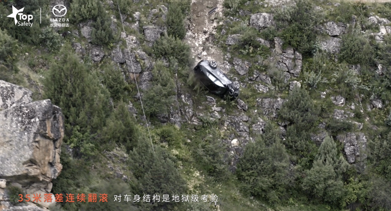翻滾事故是致死率最高的交通事故之一。在本次挑戰中,EZ-60在碰撞后從垂直高度35米陡坡滾落,相當于11層樓高度,重點考察EZ-60車身籠式結構強度和車內氣囊防護。
