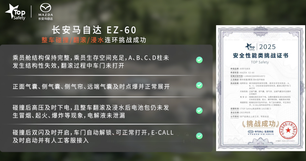 走出實驗室,安全見真章。作為長安馬自達電動化戰略的核心車型,MAZDA EZ-60(以下稱EZ-60)繼承馬自達品牌頂級安全基因,致力于為用戶打造放心、安心的新能源出行體驗。近日,長安馬自達聯合權威機構中汽中心在“勇士之路”丙察察成功完成整車碰撞/翻滾/浸水連挑戰,并獲得“TOP Safety”頂級安全證書——這是行業首個在極端自然路況中完成全套高難度安全測試的新能源中型SUV,不僅驗證了EZ-60的硬核安全實力,更以實戰成果為新能源汽車安全標準樹立全新標桿。