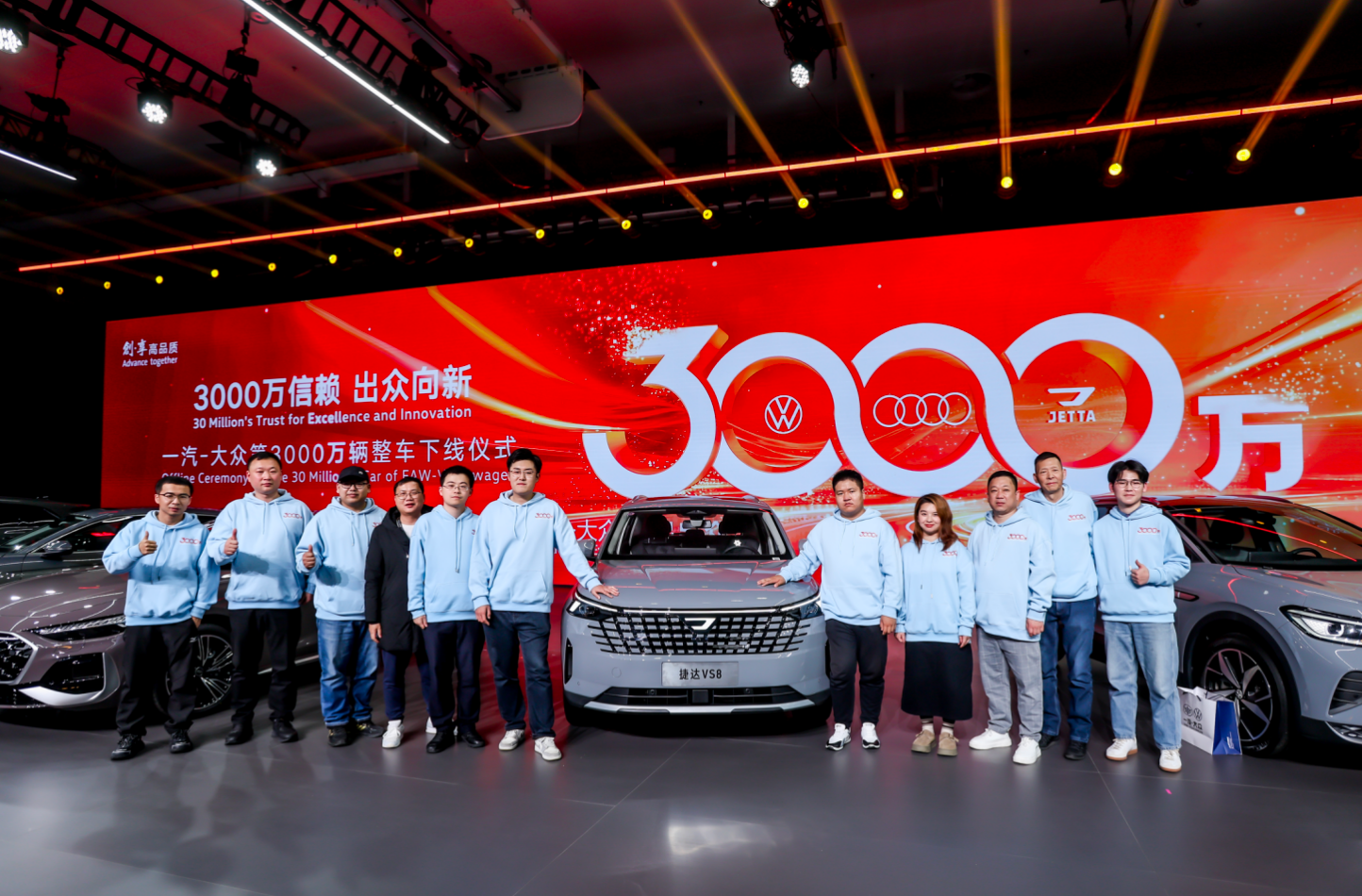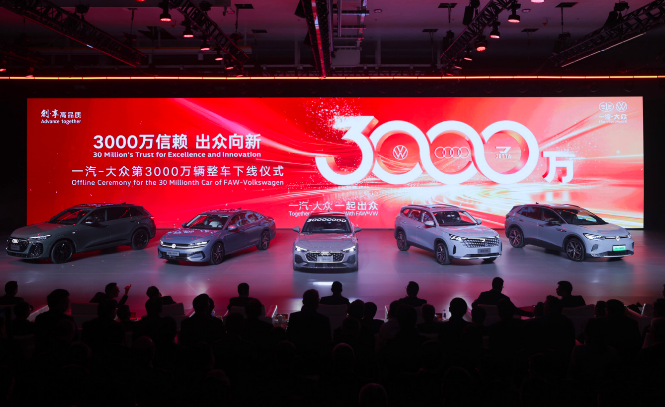 2025年10月30日,一汽-大眾迎來其發展史上的高光時刻——第3000萬輛整車下線儀式在長春總部隆重舉行。在此次以“3000萬信賴 出眾向新”為主題的盛典上,隨著捷達VS8作為3000萬里程碑車型之一,同大眾、奧迪品牌旗下的5款不同車型來到臺前,一汽-大眾也正式成為了國內首個產銷突破3000萬輛的乘用車企。